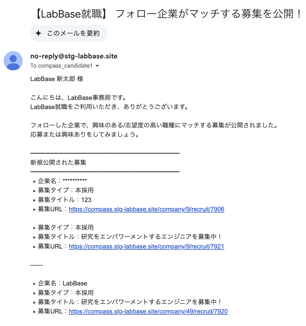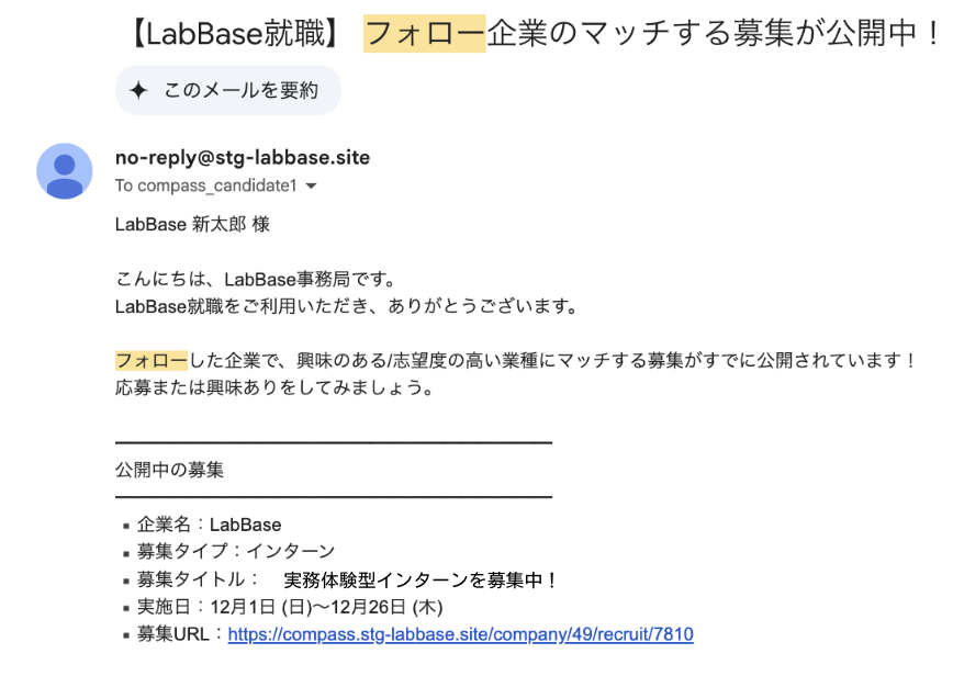 フォロー時点で、学生がプロフィールに設定した就職予定年と「興味のある/志望度の高い職種」に合致する募集を公開している場合に以下のメールが送信されます。