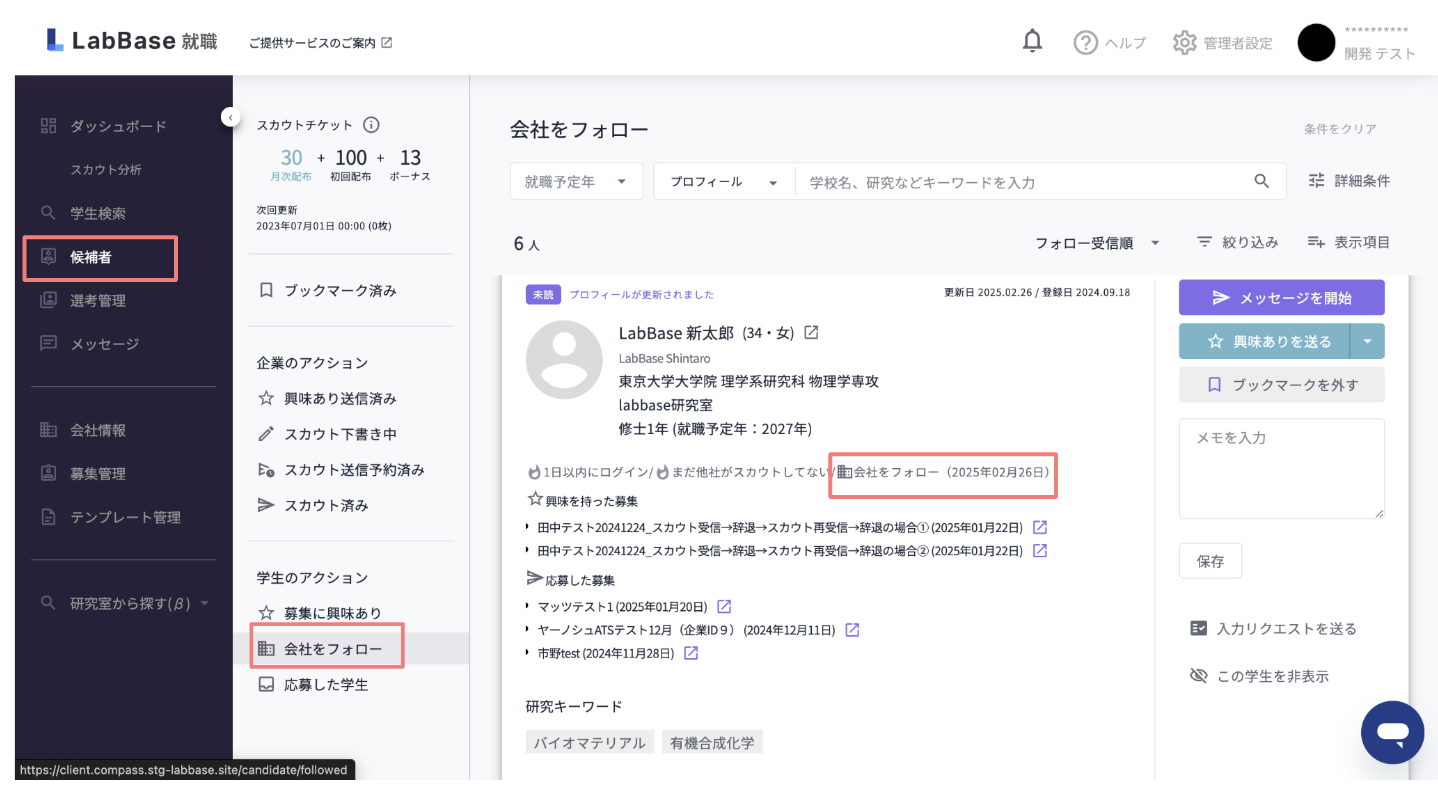 ※フォローした学生へのスカウトはチケットを消費します。ご注意ください。